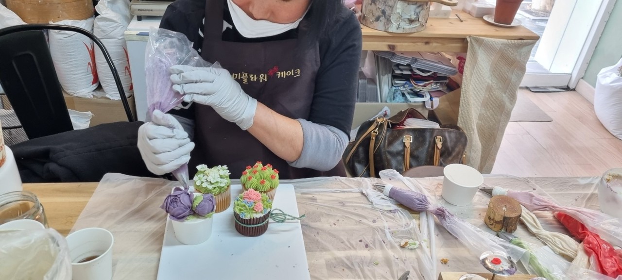 제과 국제 자격증이 있는 전문가와 함께 하는 컵케이크 꾸미기 체험.