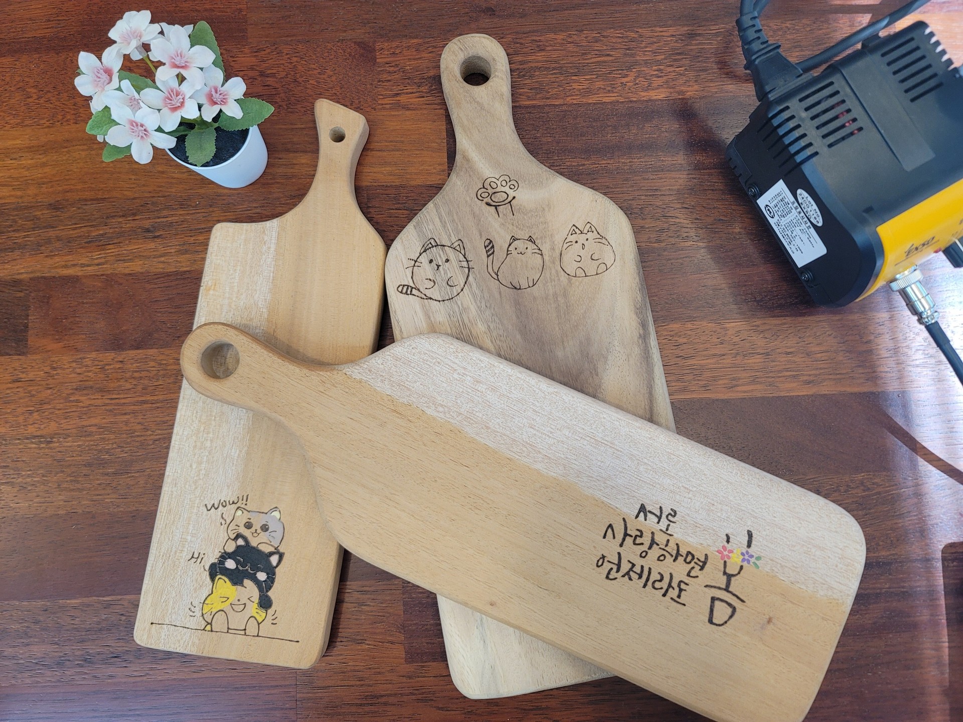 도마에 직접 그림,글귀, 캐릭터등을 인두로 새겨 세상에 하나뿐인 도마를 완성