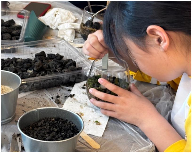 이끼, 식물, 피규어 등 주어진 재료를 활용해 배치와 구성을 스스로 결정하며 디자인 감각과 몰입감을 키웁니다.