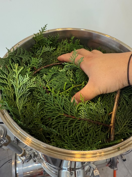 - 아로마추출기 체험 : 채취한 편백잎 아로마추출기에 넣기