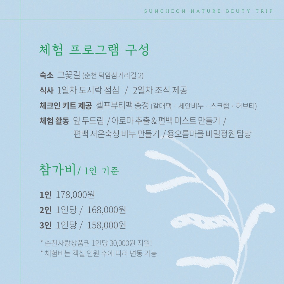 - 셀프 뷰티 팩 증정( 갈대팩, 세안비누, 스크럽, TEA 등 제공