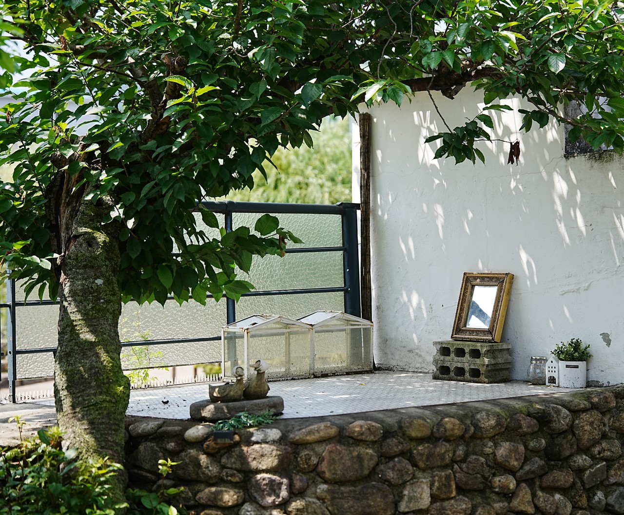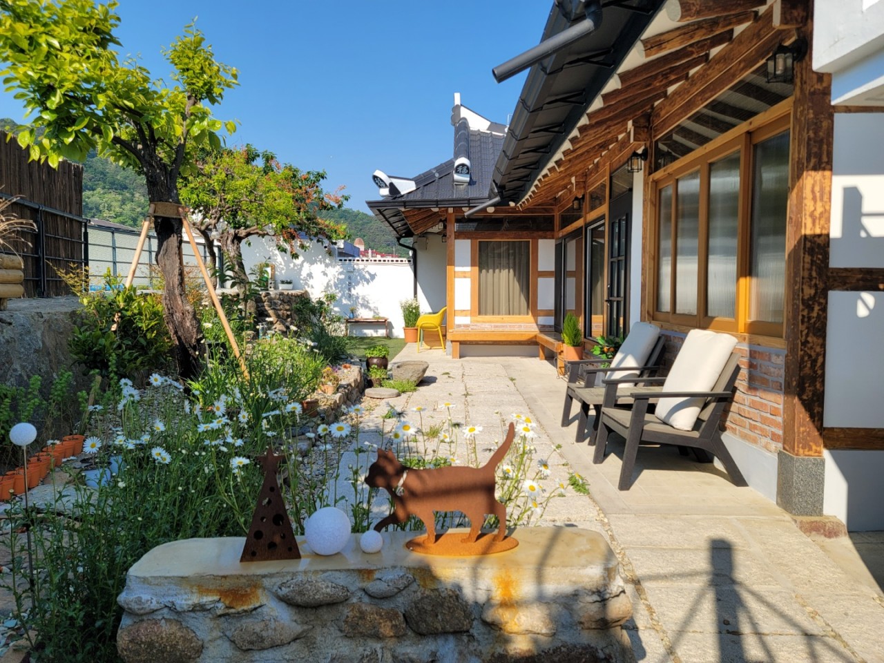 A: 들어오실 때 보셨겠지만 저희는 자연물이 정말 많고, 잘 관리되어 있어요. 신경을 많이 쓰는 편이라고 자부할 수 있고요. 꽃이 흐드러지게 피고요, 햇빛을 받으면 정말 예뻐요. 저희 마스코트라고 할 수 있어요. 근처 공방 사장님이 만들어주신 오리 두 마리도 담벼락 위에 위치해 있어요. 방문하실 때 이런 소소한 재미들을 찾아주시면 더 뜻깊은 하룻밤이 되지 않을까요?