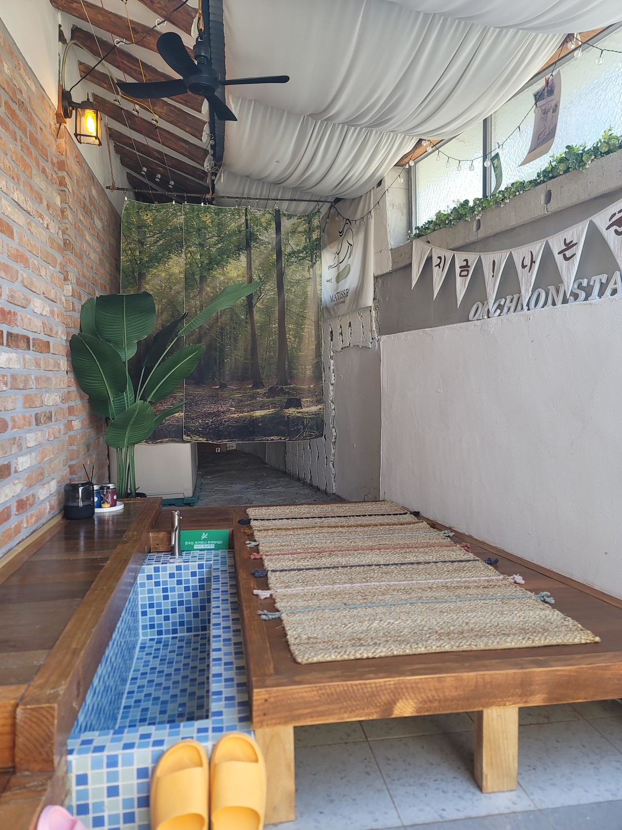 A: 화장실을 좀 특이하게 인테리어를 했는데, 세면대 두 개를 둬서 커플이나 가족이 오면 같이 쓸 수 있게 하였고, 뒷마당에 족욕을 할 수 있는 공간을 마련했어요. 툇마루를 반대편으로 늘리는 식으로 설계해서 더 편안하게 쓰실 수 있도록 만들었고, 여기 침상마루에서 이불을 치우고 창밖을 잘 보이게 하면 손님들이 참 좋아하세요. 우디향 디퓨저나 재즈 음악 같은 건 저희 취향인데, 좋다고들 많이 해주세요.